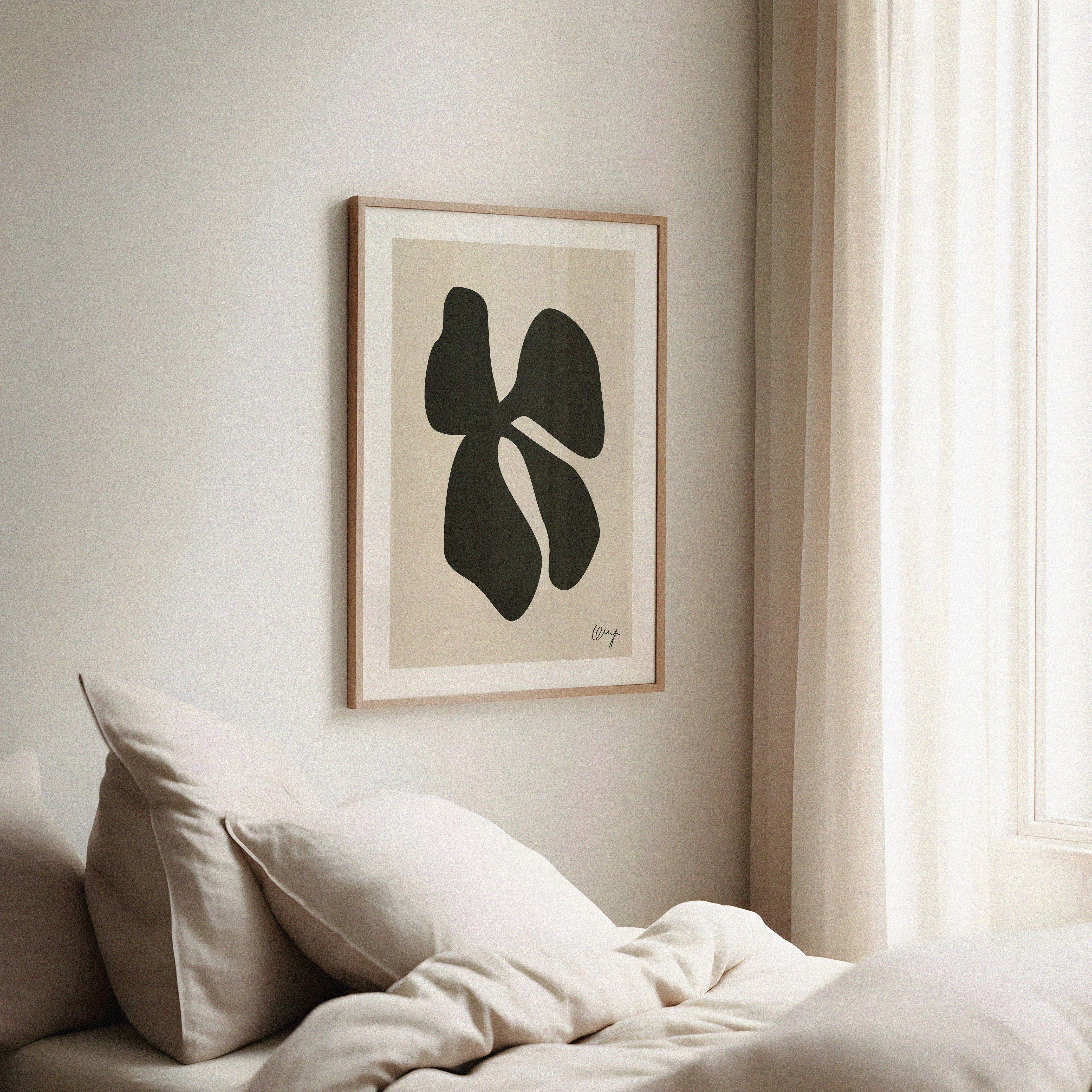 Minimalistisches Poster mit einem abstrakten schwarzen Design auf beigem Hintergrund. Perfekt für moderne und stilvolle Wanddekoration!