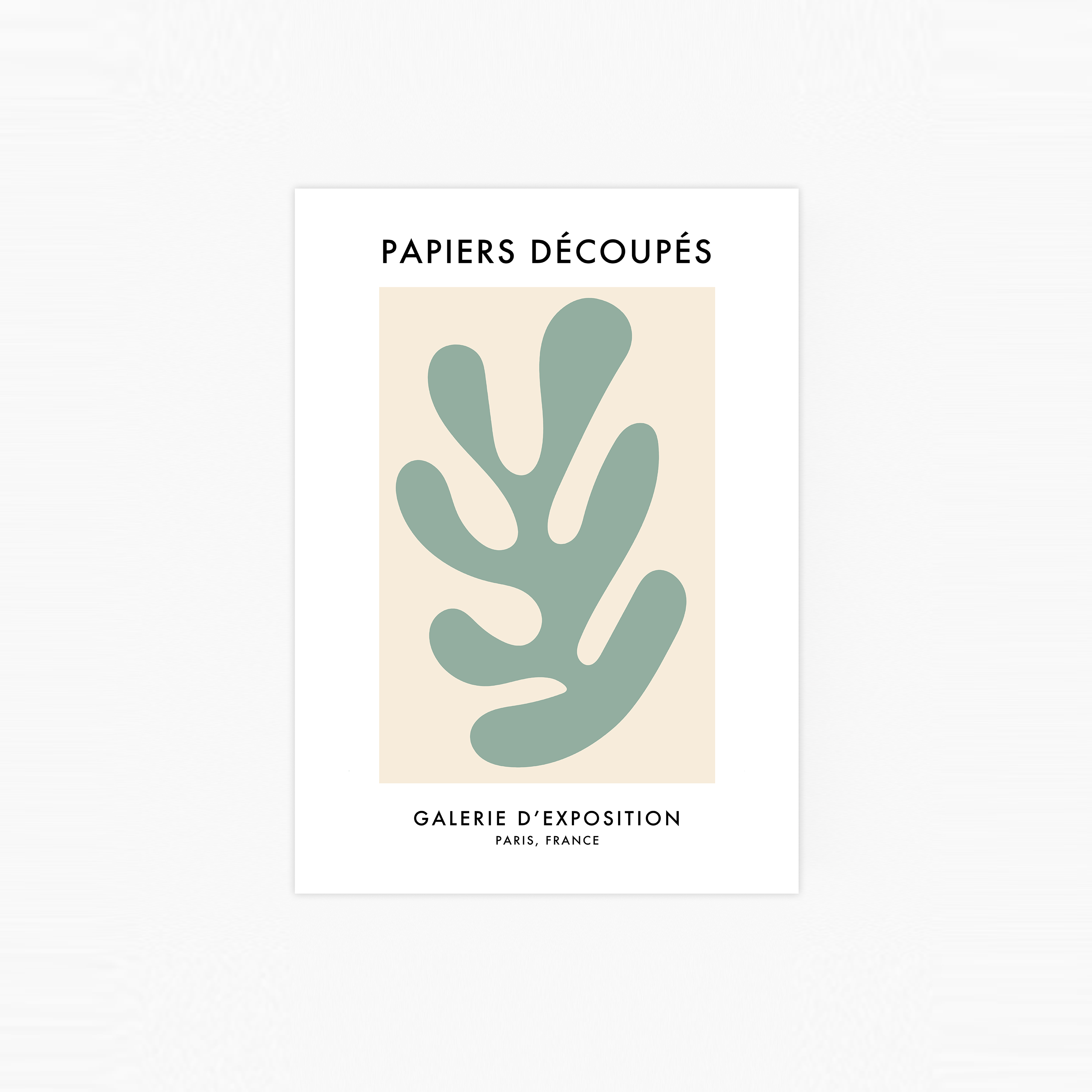 Abstrakte Grafik mit einem grünen Ausschnitt auf beigem Rechteck vor weißem Hintergrund. Inspiriert von der farbenfrohen Kunst des Fauvismus aus dem frühen 20. Jahrhundert.