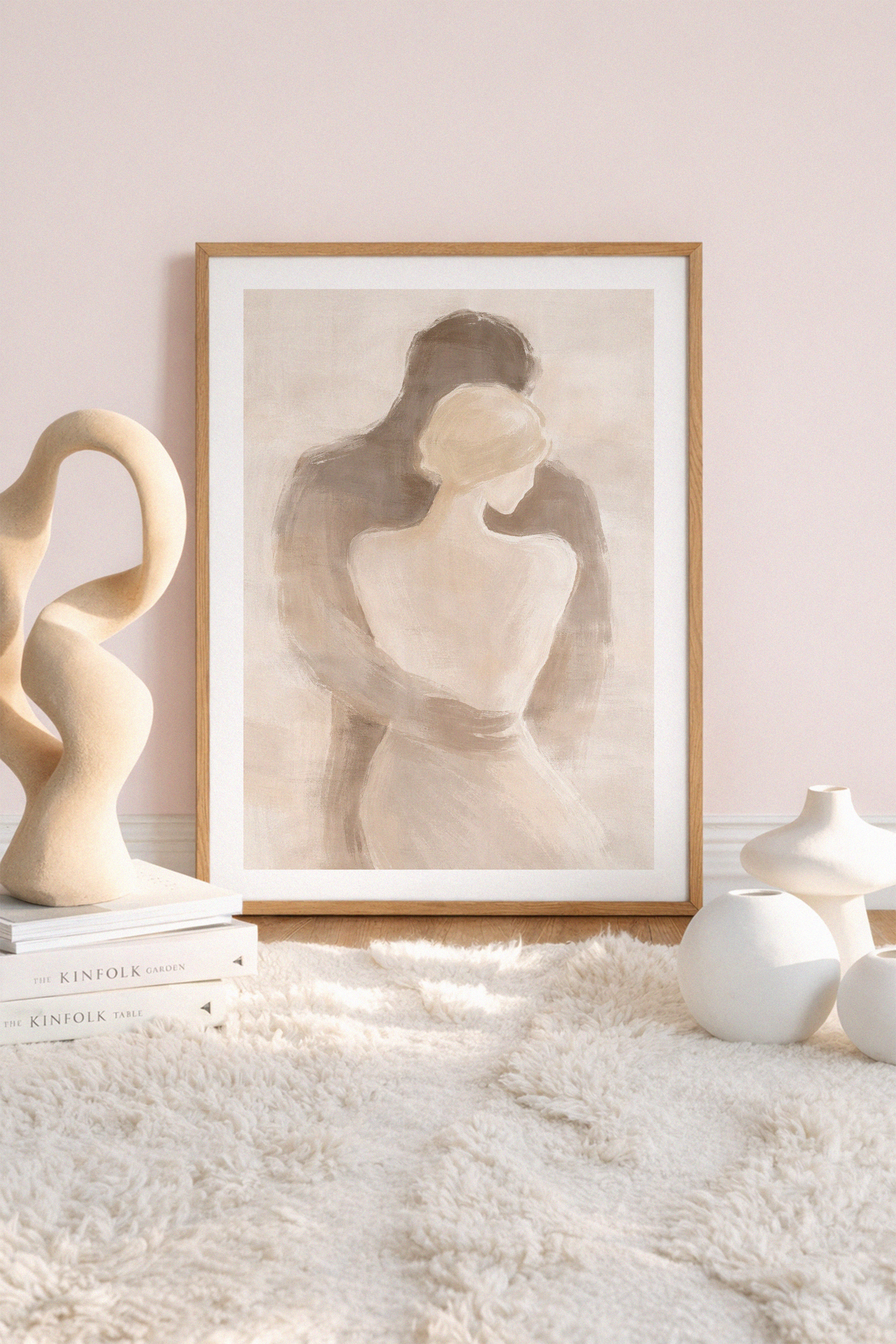 Eine ruhige, intime Szene in sanften Beige- und Naturtönen. Die weich gemalten Figuren verschmelzen fast miteinander und vermitteln Nähe, Geborgenheit und stille Emotion. Zeitlos, zurückhaltend und perfekt für Räume, die Ruhe und Wärme ausstrahlen.