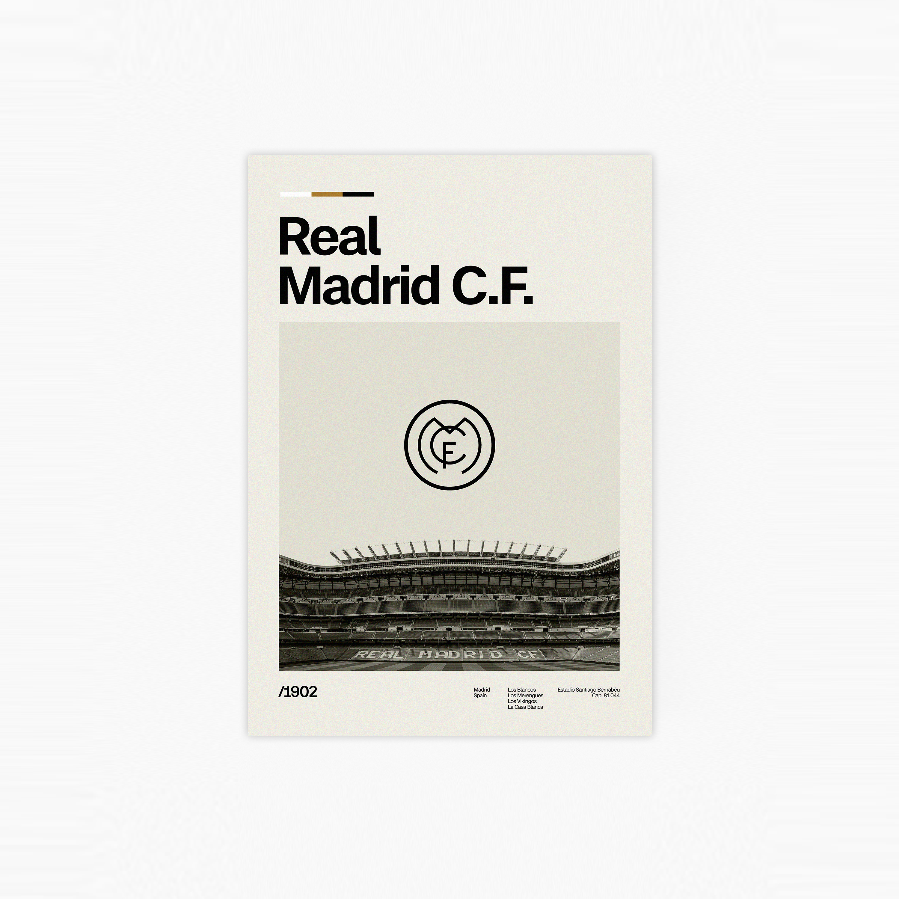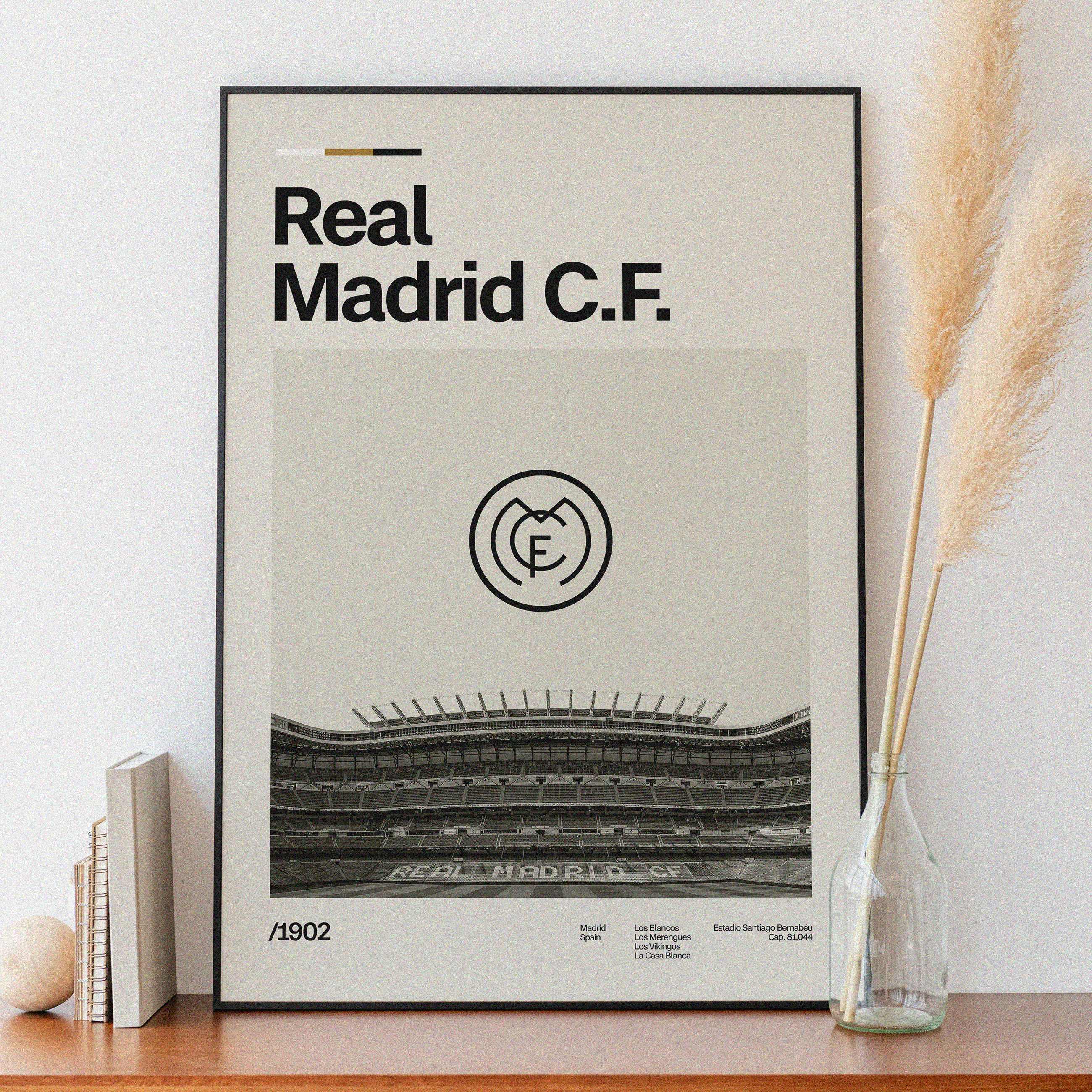 Ein Poster von Real Madrid C.F., das das berühmte Estadio Santiago Bernabéu im Hintergrund und das markante Vereinslogo im Vordergrund zeigt. Die weißen Farben des Logos symbolisieren Eleganz und Erfolg, während das Stadion eine Atmosphäre von Geschichte und Glanz ausstrahlt. Ein Muss für jeden treuen Fan, der die glorreiche Tradition und den Stolz dieses angesehenen Clubs feiern möchte.