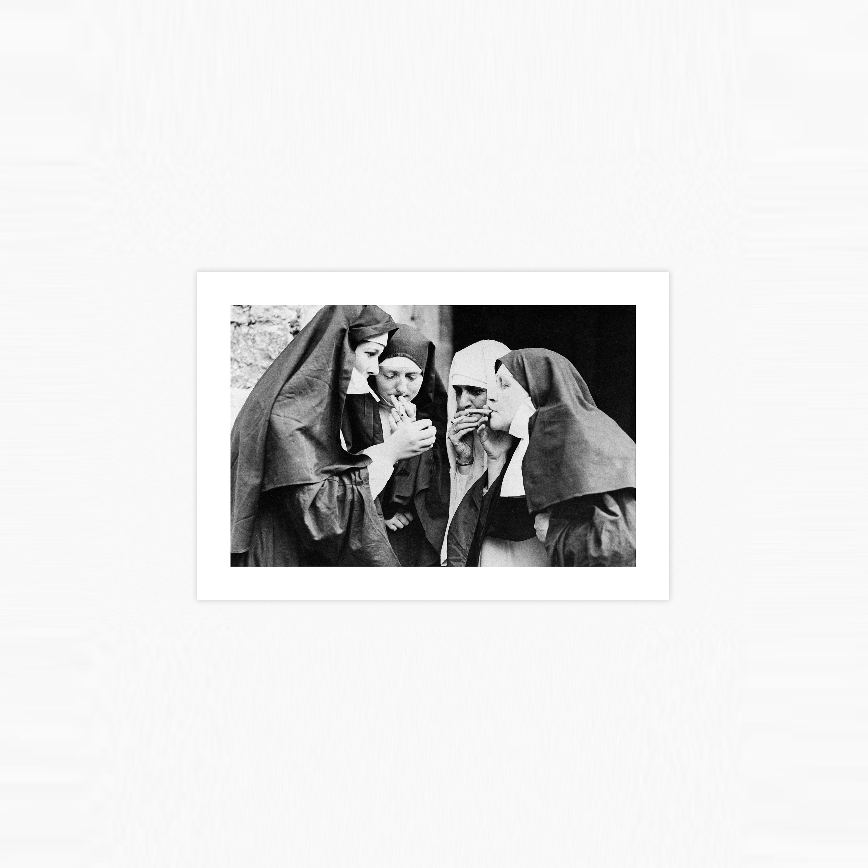 Ein Schwarz-Weiß-Foto aus den 60er Jahren in England zeigt eine Gruppe von Nonnen, die sich gerade eine Zigarette anzünden. Der unerwartete Kontrast der rauchenden Nonnen verleiht diesem Bild eine besondere Ausstrahlung, die perfekt in ein modernes, stilvolles Zuhause passt. Die altersbedingte Körnigkeit des Fotos verstärkt den Vintage-Look und macht es zu einem hervorragenden Highlight in einer schwarz-weißen Bildergalerie. Das "Smoking Nuns"-Poster verfügt zudem über einen integrierten weißen Rand, der das Motiv elegant zur Geltung bringt.